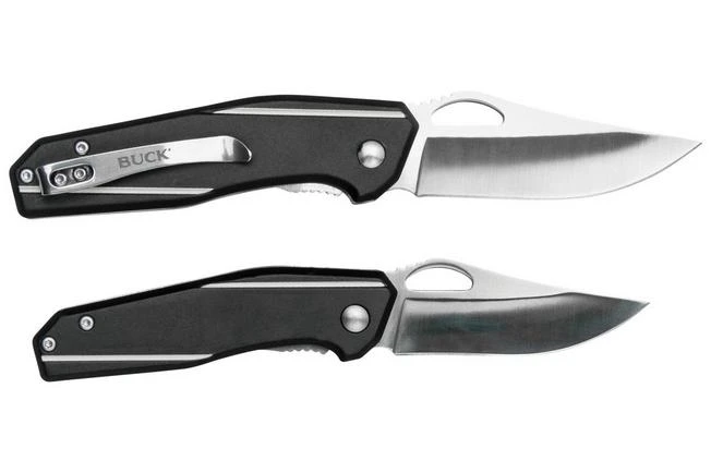 The Buck 246 & 247 Collector’s Set is a nice collector’s set of two Buck knives. In terms of design and material choices, the knives are identical. The only difference is in the size and the pocket clip. The 247, which is the larger of the two, has a pocket clip. Its little brother doesn’t have a pocket clip. Due to its size, the small knife is easy to carry with you, so it doesn’t need one. The opening system works the same for both knives, because you use a thumb hole. When opened, a solid liner lock holds the blade in place.