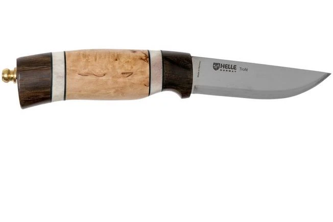 The Helle Trofé 85 is a cool fixed knife, designed for all-round outdoor use. From hunting to bushcraft: this traditional Norwegian knife will excel everywhere. The blade is made from Helle’s laminated stainless steel. It retains its sharpness well and is easy to sharpen. The handle is made from dark oak wood, curly birch and stag horn.