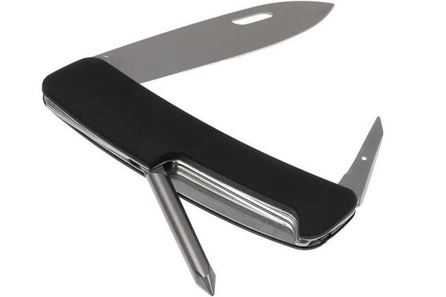 The Swiza D02 is a contemporary knife inspired by classic Swiss pocket knives. The first thing you’ll notice is the knife’s modern, ergonomic design. The innovation is evident when you look at the lock. You unlock the knife by pressing down the logo on the handle. Swiza has also taken left-handed users into account with a cut-out in the blade that can be used from both sides.