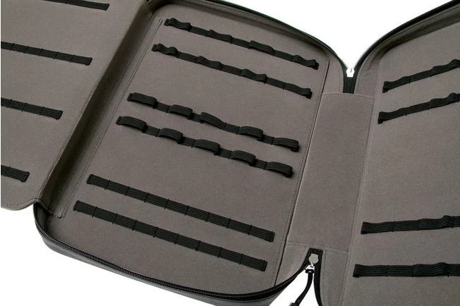 The Victorinox collection case 9.6954.0 is the perfect storage place for your Swiss pocket knives. You can use it to store quite the collection! From small Victorinox SD to larger models such as the Rangergrip. The inside of the case has three surfaces, each enhanced with different-sized elastic loops. As such you can store dozens of knives, depending on which types you place above/next to each other.